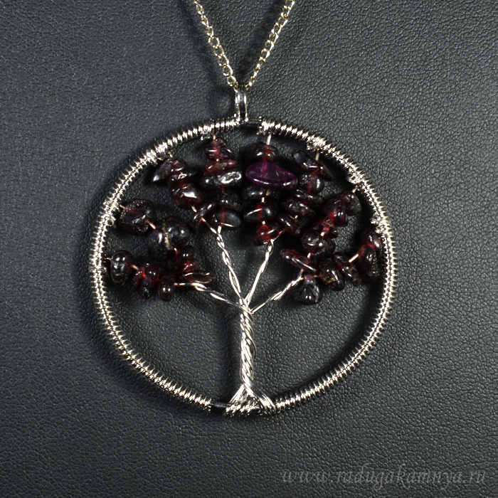 Подвеска "Дерево Жизни" с крошкой из граната, круг 52мм. Материал — Гранат Натуральность камня — Натуральный камень