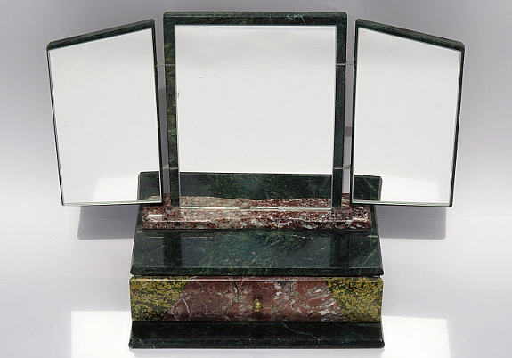Шкатулка выполнена из змеевика и креноида. Сверху тройное зеркало , нижний ярус открывается вперед до ограничителя. Внутри отделано бархатом.Размер: 230*140*280
