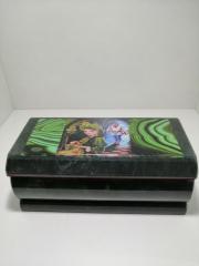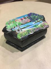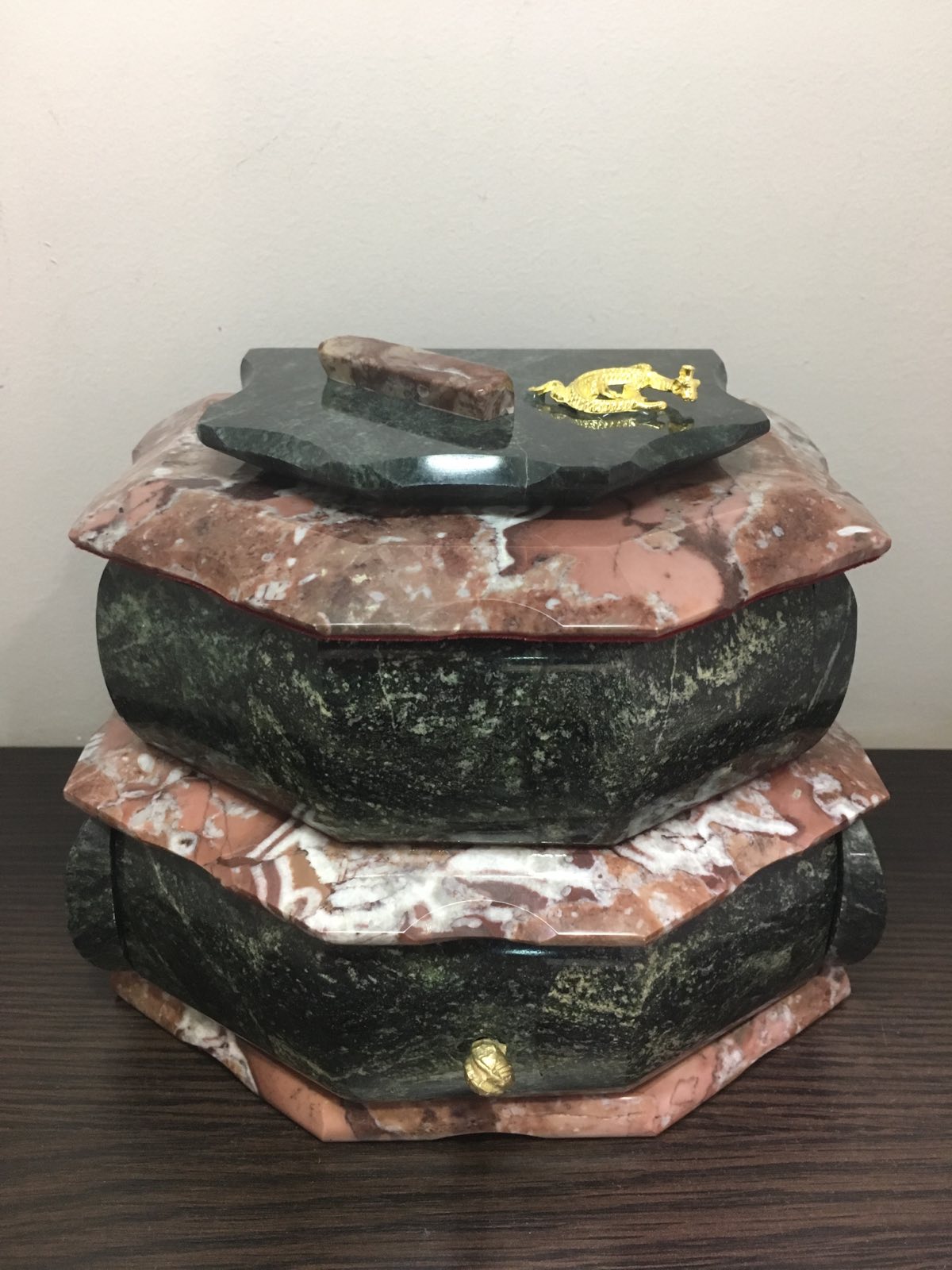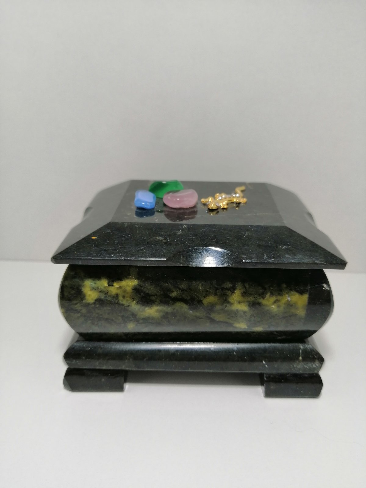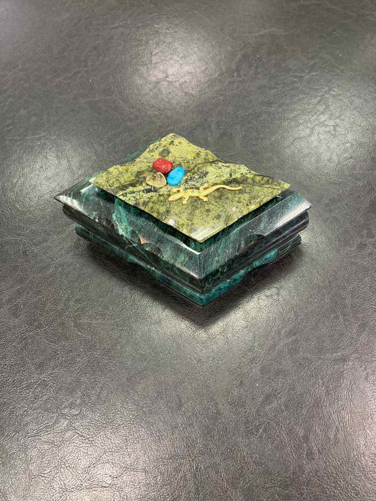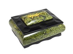 Шкатулка в два уровня, выполнена из змеевика. Верхняя крышка открывается на шарнире, нижний ярус открывается вперёд. Внутри отделано бархатом, верний ярус дополнен зеркалом. Сверху шкатулки приклеена ящерица из литьевого металла.Размер: 170*110*130