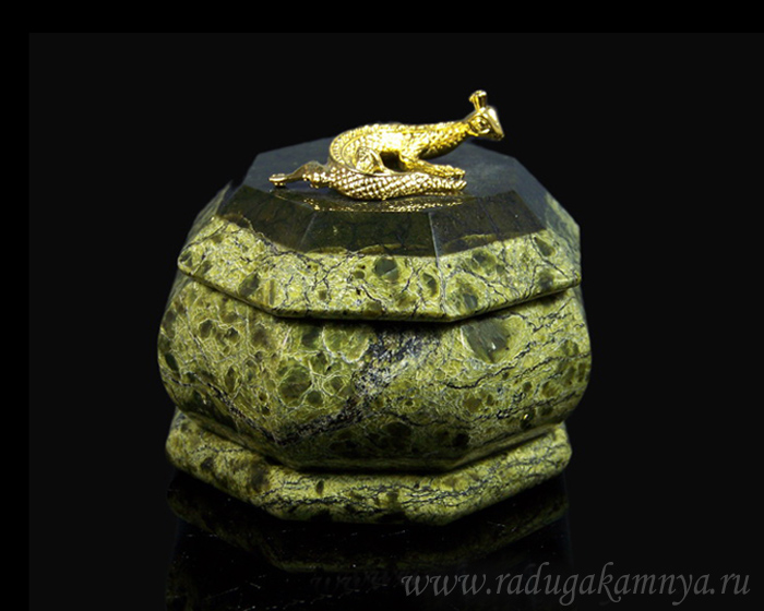 Шкатулка выполнена из змеевика и креноида.